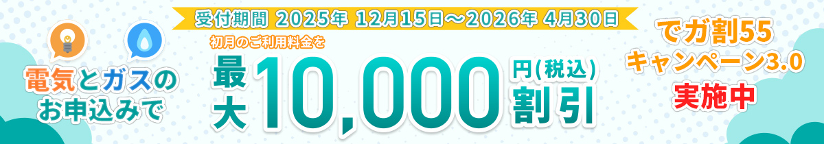 2025年12月15日から2026年3月31日の期間に、電気または都市ガスのお申込みをいただき、2026年5月31日までに電気または都市ガスの供給が開始されたお客さま