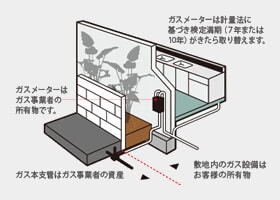 The ownership of city gas facilities and community gas facilities is divided at the public-private boundary, or the road boundary. Gas pipes on consumers’ premises and those incorporated into buildings are under consumers’ ownership, with the exception of gas meters. These pipes are called private gas pipes. Gas pipes outside consumers’ premises are assets of Nippon Gas Co., Ltd.
