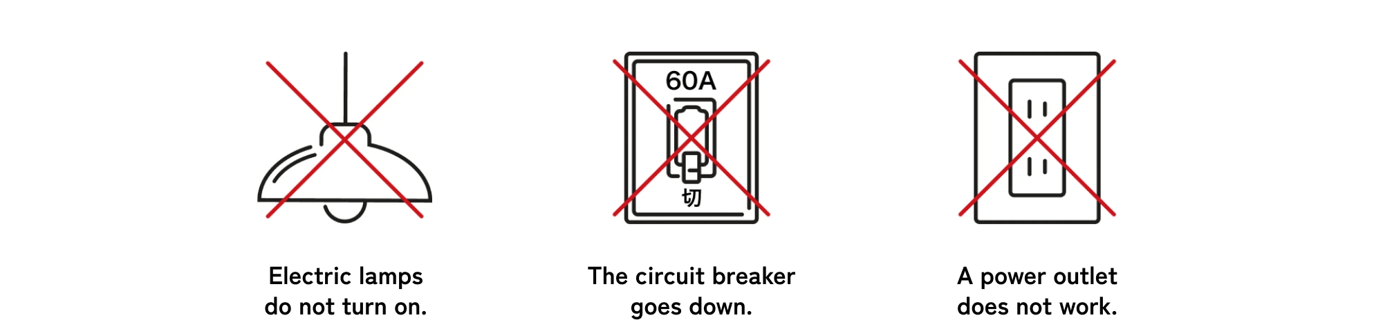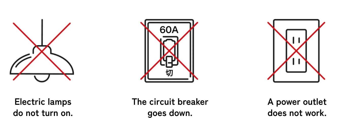 An investigation into the causes of the failure of electrical equipment or power distribution within 60 minutes and the visit by professionals will be free of charge. Components, special work, any work that takes 60 minutes or longer and a secondary response including troubleshooting will be at your expense.