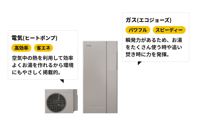 電気とガスそれぞれの強みを生かし効率的にお湯を作るため、環境とお財布にダブルで優しい給湯器です。