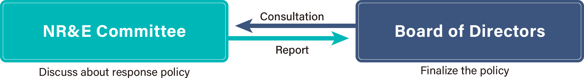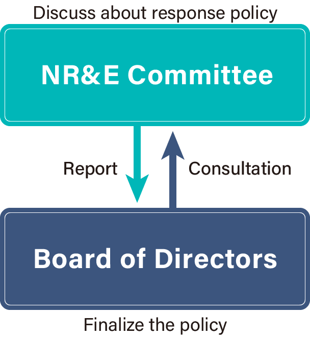 The NR&E Committee, which is an advisory body to the Board of Directors and of which outside officers make up the majority, objectively discusses NICIGAS’ agenda regarding environmental issues as a core component of our medium- to long-term strategy as well as addresses them as key considerations for us. This Committee evaluates sustainability-related risks and opportunities, deliberates on initiative policies, and at least once a year reports and makes suggestions to the Board of Directors, where final policies are determined.