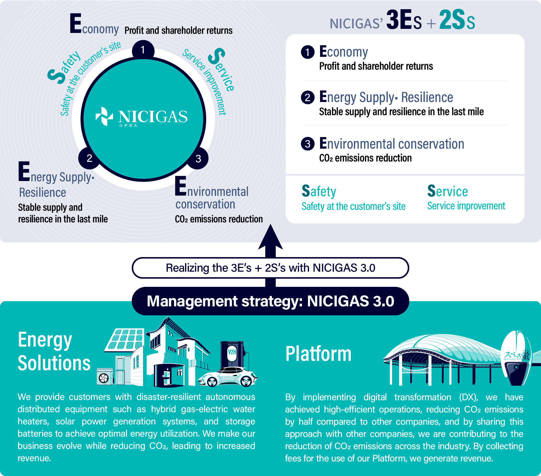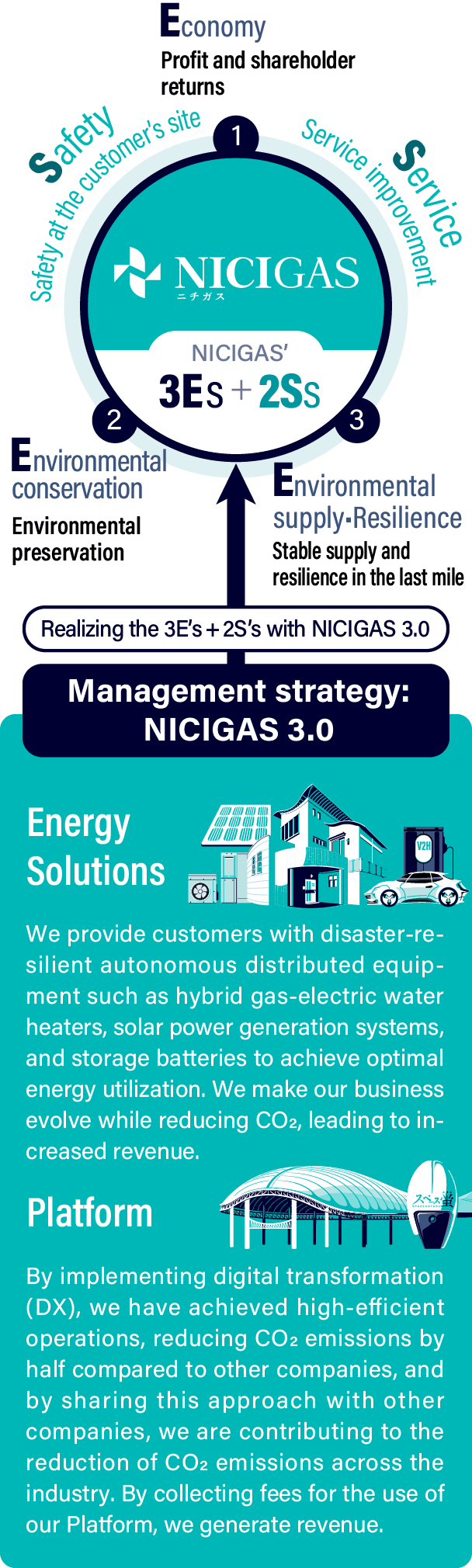 We are committed to “Energy supply・Resilience (stable supply and resilience in the last mile)”, “Environmental conservation”, and “Economy (profit and shareholder returns)”, based on Safety (Safety at the customer’s site) and Service (service improvement).