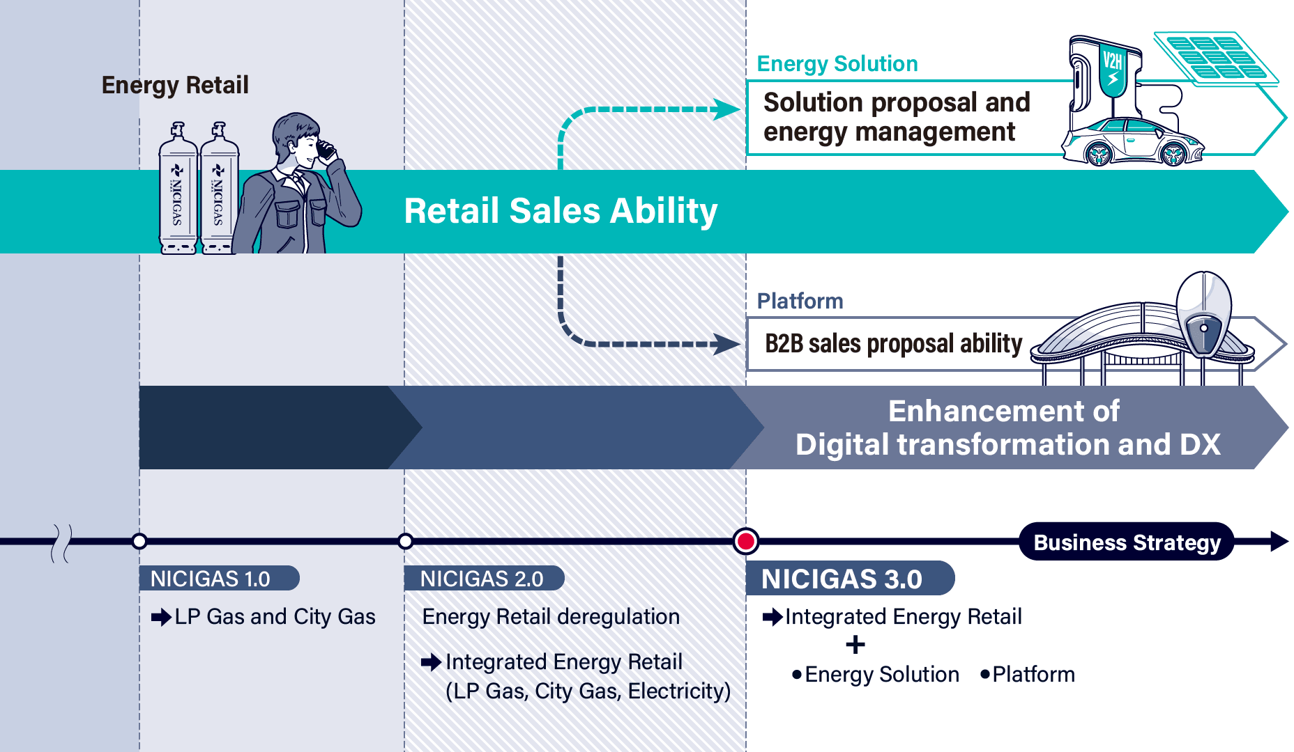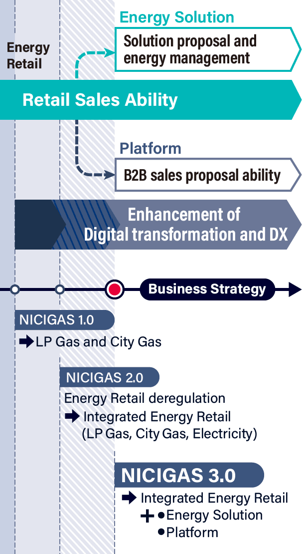 With its mission of contributing to local communities through energy, NICIGAS will continue to grow through expanding its customer base by providing services that customers choose. In order to make further progress, putting the Energy Retail business (both purchase and sell gas and electricity) at core, we will evolve the business into (1) the Energy Solution business that attains optimal energy use for each household and the entire community through the usage of solar panels, storage batteries, hybrid water heaters, etc. and (2) the Platform business that shares our infrastructure optimization with the LP Gas industry as the whole, including LP Gas filling and delivery. Through NICIGAS 3.0, we aim to grow our business while addressing social issues such as environment and labor shortages, and achieve a market capitalization of 500 billion yen by FYE 03/31.