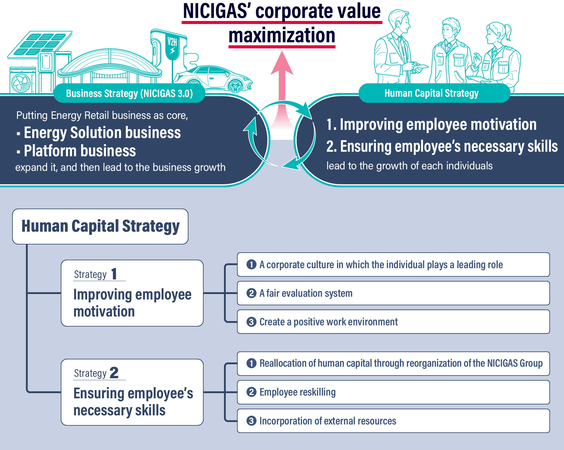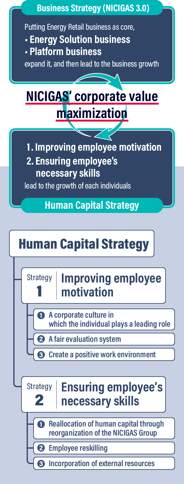 NICIGAS’ human capital strategy aims to accelerate our new medium- to long-term growth strategy of Energy Solution business and Platform business centered on Energy Retail business through the maximization of human capital. We believe that the key to maximizing human capital is the growth of each and every employee through improving employee motivation (Improving employee motivation) and ensuring employee’s necessary skills (Ensuring employees necessary skills). By sharing what we aim for with all employees and providing opportunities for employees to take on challenges even if they are inexperienced, it believes that we can raise the level of employees’ willingness to grow voluntarily and develop the strengths of each employee.
