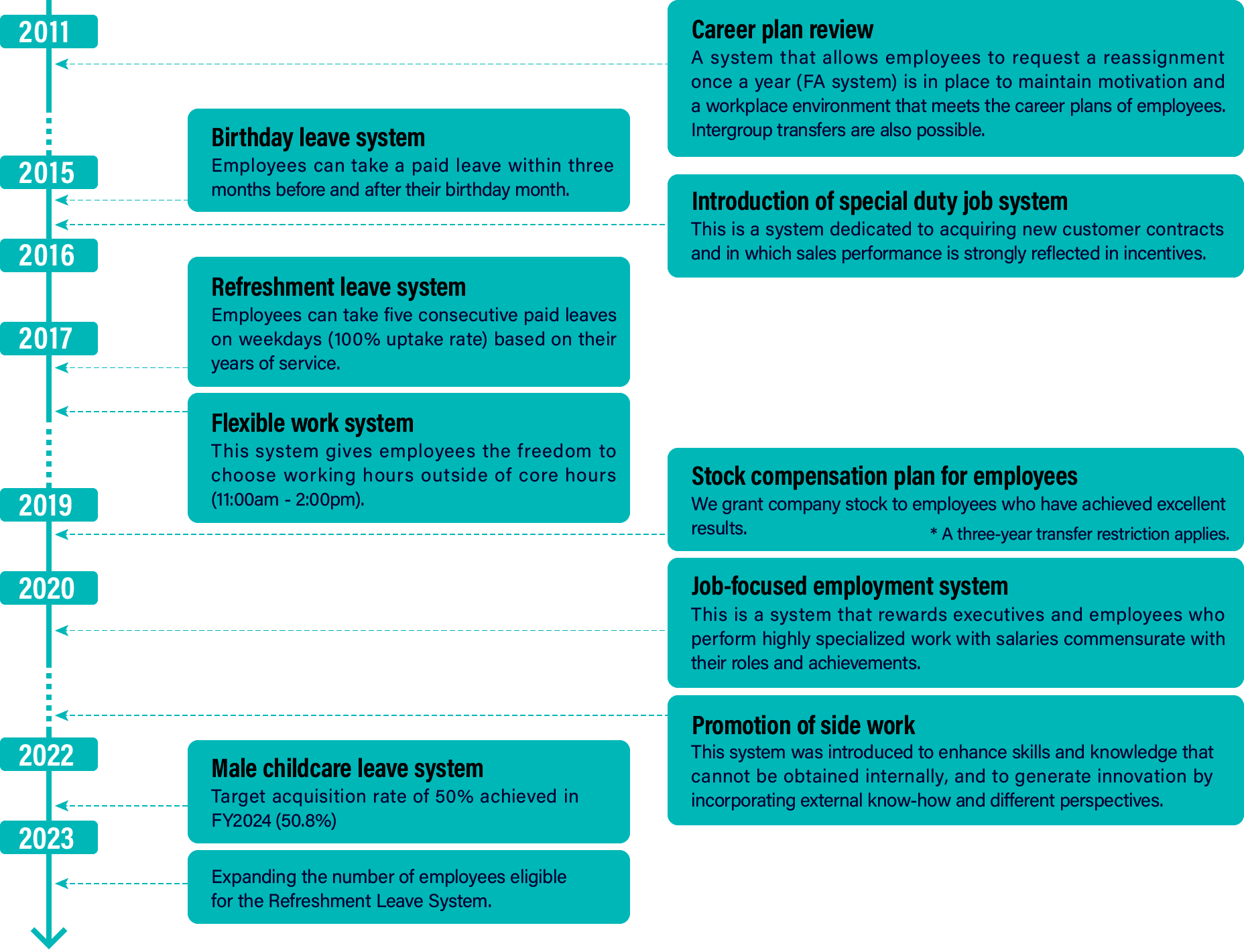 The reason for this is we believe that as women continue to be active and advance their careers, it is important for men to actively participate in childcare and household chores. We conduct questionnaires for male employees who have taken childcare leave, and use the results to improve future measures.