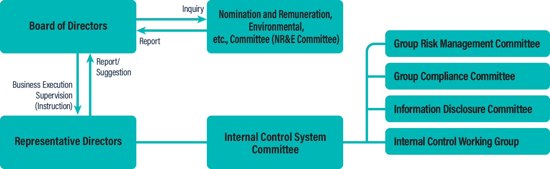 In order to establish a structure to ensure operational integrity, NICIGAS has established the Internal Control System Committee (Chairperson: Representative Director, Chief Executive Officer), under which the company has organized the Group Risk Management Committee (Chairperson: Corporate Headquarters, General Manager), the Group Compliance Committee (Chairperson: Corporate Headquarters, General Manager), the Information Disclosure Committee (Chairperson: Corporate Headquarters, General Manager), and the Internal Control Working Group (Chief Supervisor: Legal Department, General Manager).