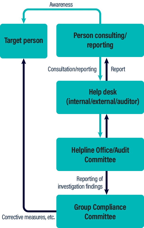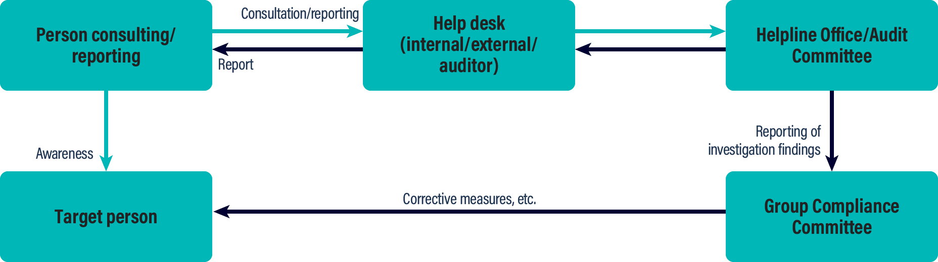 A Group Helpline has been established to prevent compliance violations and their recurrence. Reports are investigated by the Helpline Office, and if corrective actions are required, they are deliberated by the Compliance Committee and necessary measures are taken. Besides protecting the privacy of whistleblowers, the Company takes appropriate measures to prevent unfair treatment, such as dismissal, or deterioration of the work environment. The status of responses is regularly reported to the Board of Directors for discussion. Additionally, self-assessments are conducted to verify that the helpline is being operated appropriately in compliance with relevant laws.