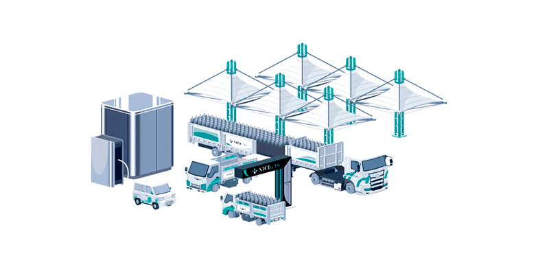 デポステーションは、無人で24時間稼働可能なLPガスの容器置き場。夢の絆・川崎などの大型充填工場と併せて利用することで、充填からお客様にお届けするまでの配送にかかるコストを大幅に短縮することが可能です。