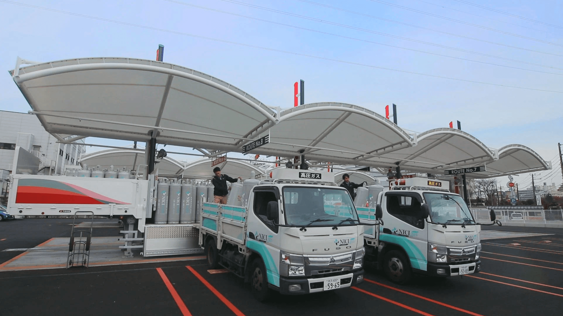 まず、トレーラーは夢の絆・川崎などの充填工場で充填された容器約200本を積載し、デポに向かいます。デポでは、所定の置き場所に停車。トレーラーヘッドを外せばそのまま荷台が容器置き場になります。