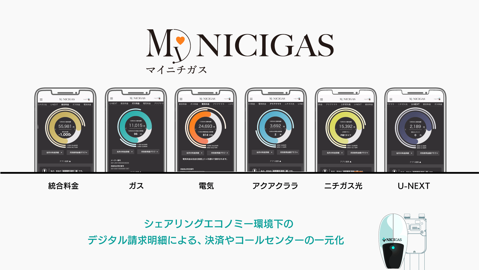 マイニチガスは、ガスや電気以外にも、導入企業が提供しお客さまが使用しているサービスのご利用明細が、一元管理できる仕組みになっています。例えばインターネット回線や動画のサブスクリプションなど、お客さまがご契約中の全サービスの請求額が一目で確認できます。たった一つのアプリで、あらゆるサービスがお客さまと繋がる。マイニチガスはそんな世界を目指しています。