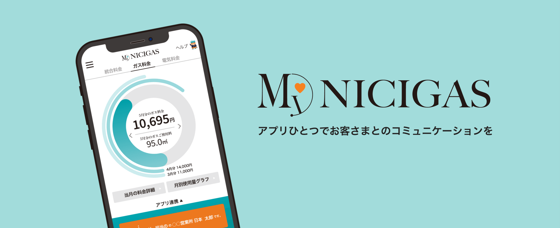 マイニチガスは、ニチガスが開発した「個人のお客さま」向けアプリ。お客さまとのコミュニケーションが変わります。導入すると、月々のエネルギー使用量、各種サービス利用料金のお知らせやチラシの配信など、アプリ一つでお客さまとのコミュニケーションをとることができます。