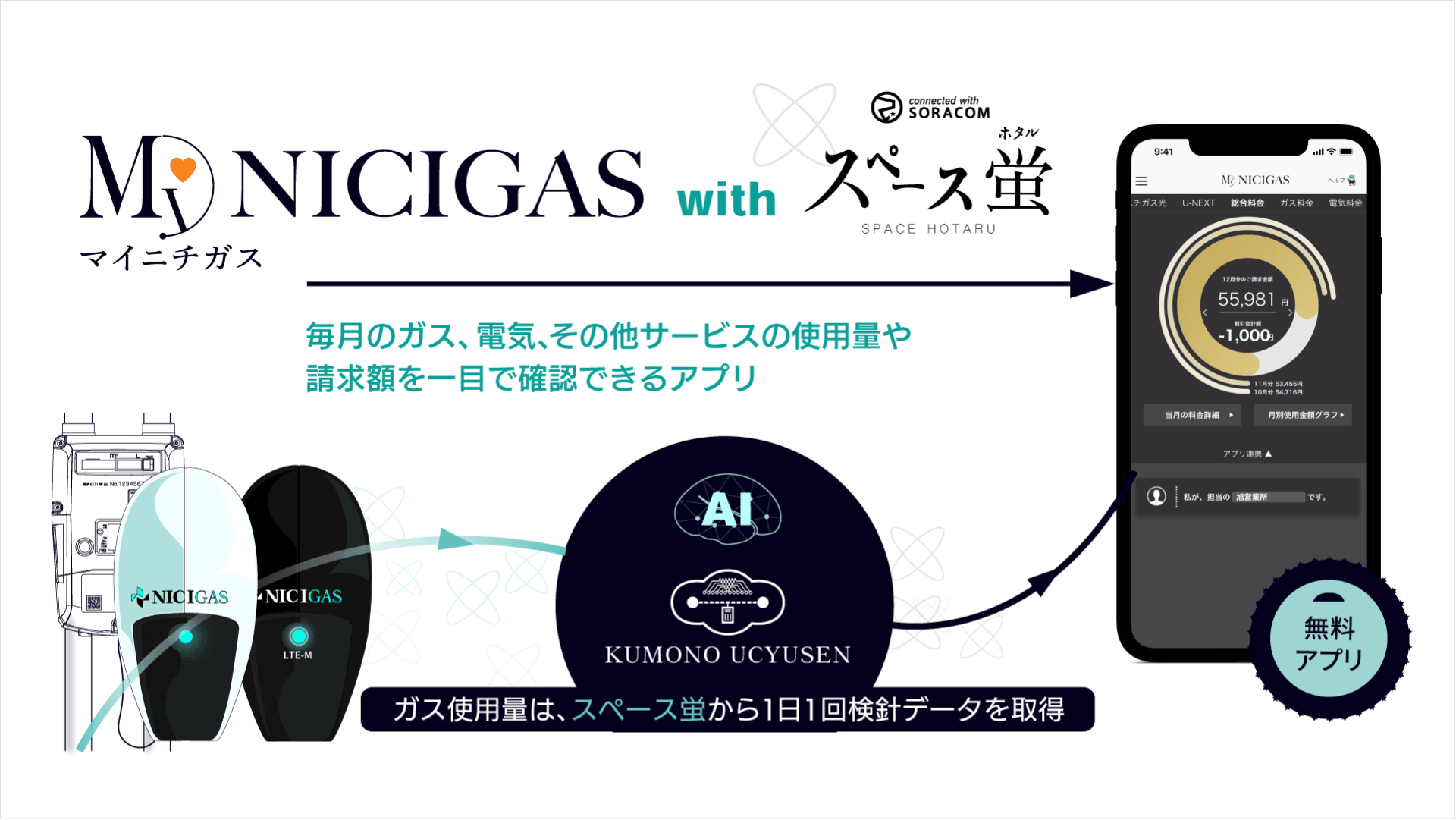 ガスメーターをオンライン化するIoT機器、「スペース蛍」で集めた検針データは、マイニチガスにより可視化されます。導入企業は、スマホ画面上でガスや電気の使用量、請求額をペーパーレスでお客さまへお知らせできるため、毎月の検針票を発行するコストおよびCO2排出量の削減につなげることができます。