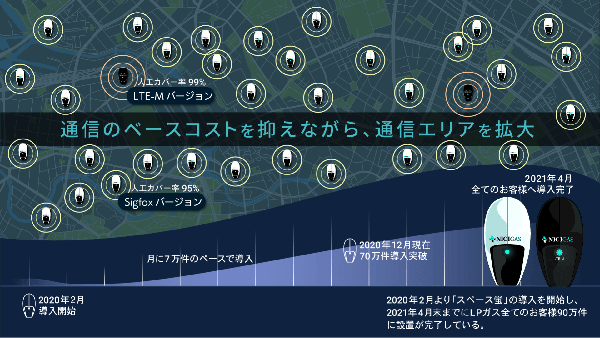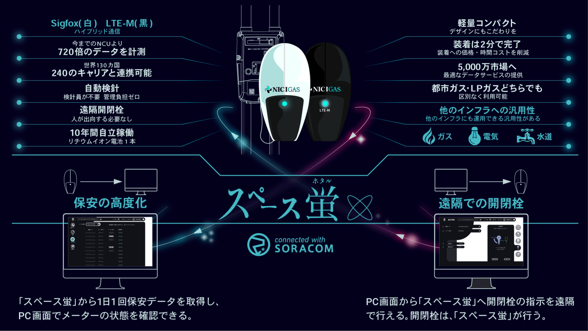 スペース蛍は、ニチガスがソラコム社と共同開発した新型NCU※。ガスメーターをオンライン化し、自動検針や開閉栓、保安データの取得を可能にします。小型で導入コストが安いのが最大の特徴で、取り付け時間はたったの約2分。いままで検針や開閉栓にかかっていた業務コストを削減できるうえ、取得可能なガス使用量データのボリュームが、従来の720倍に。また、データが迅速に取得できるので微小漏洩などが確認でき、保安の高度化にも貢献します。スペース蛍で取得したこれらのデータを活用することで、供給プランの最適化につなげることができます。