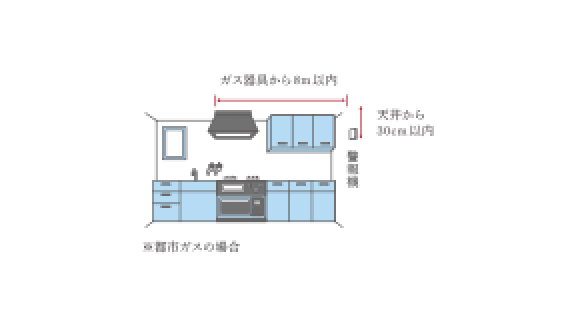 都市ガス用のガス警報器は、右の図のように天井に近い場所に設置し、周りに遮蔽物がないことを確認してください。
