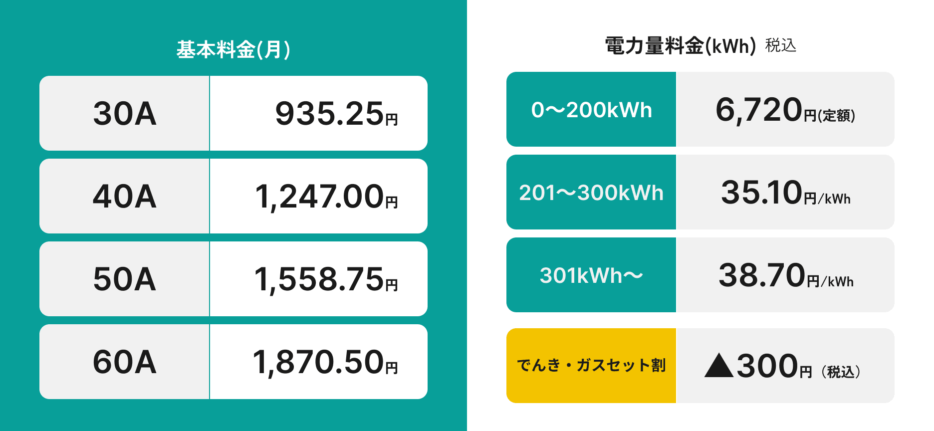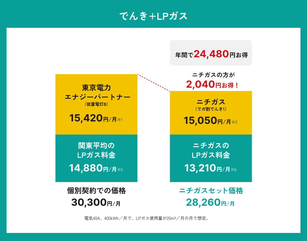 「でんき・ガスセット割」の300円(税込)割引を含む試算です。ガスのご契約がない場合は、「でんき・ガスセット割」は適用されません。「でんき・ガスセット割」を含まない料金では、おトクとならない場合があります。