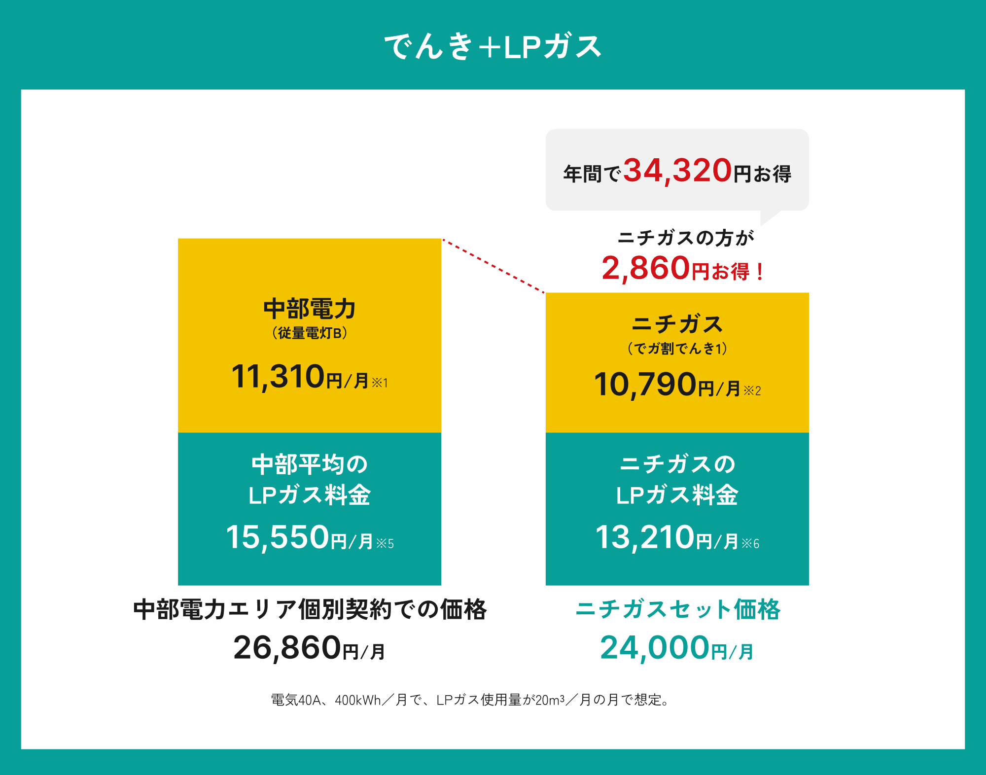 「ニチガス(でガ割でんき1)」は、当社の電気需給約款[低圧](中部エリア)(2025年11月1日実施)より算定し、セット割を含みます。