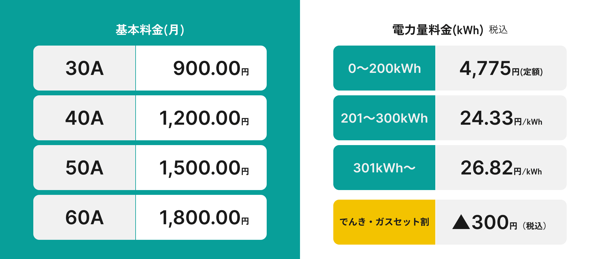 「でんき・ガスセット割」の300円(税込)割引を含む試算です。ガスのご契約がない場合は、「でんき・ガスセット割」は適用されません。「でんき・ガスセット割」を含まない料金では、おトクとならない場合があります。