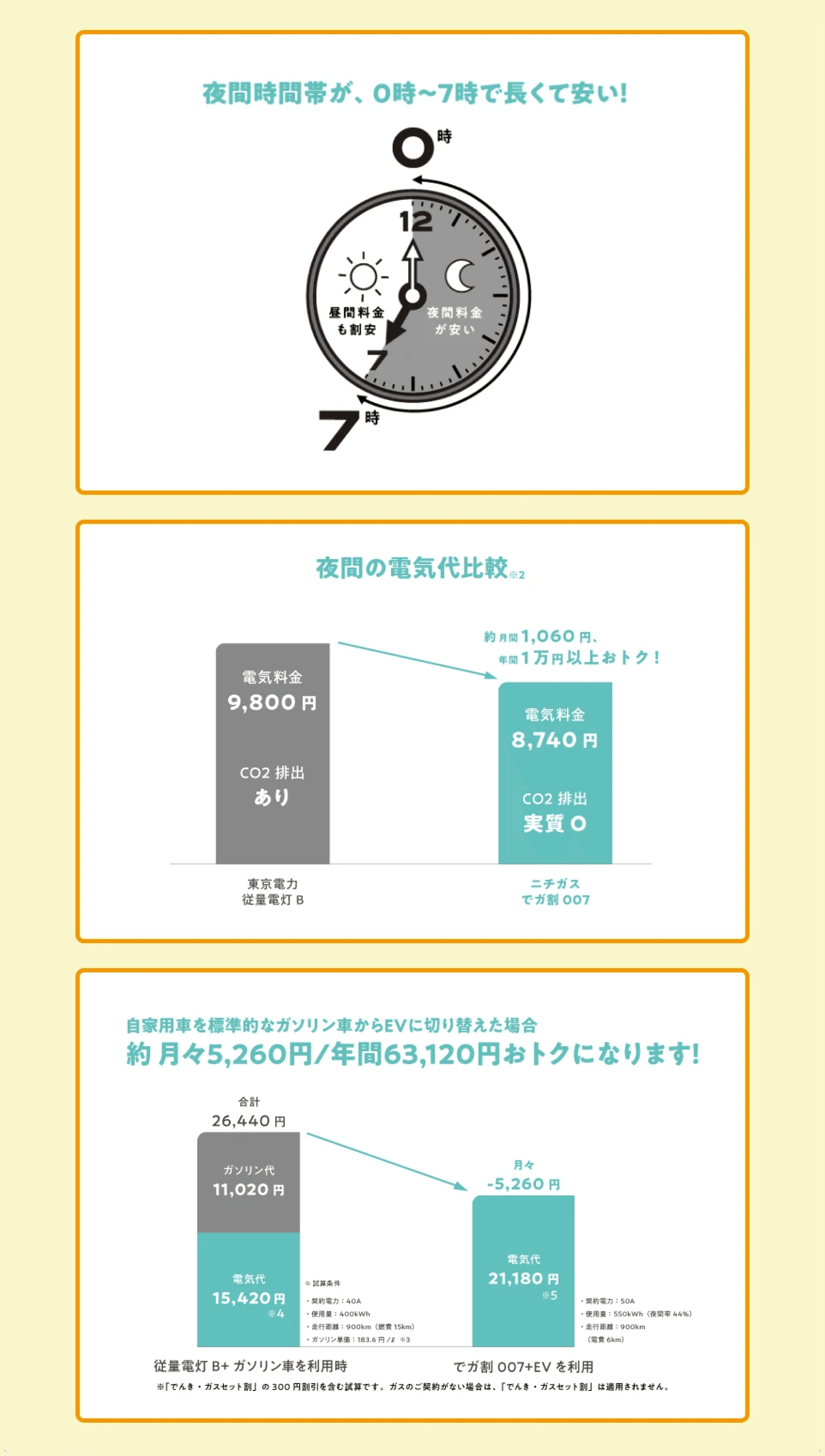 「夜間の電気代比較」は、EVの充電を想定した550kWhの使用量を前提に、夜間率44%とした場合の夜間使用量242kWhに対して、でガ割007は夜間料金単価、従量電灯Bは第3段階料金単価を乗じた試算であり、基本料金は含みません。なお、「でガ割007」は当社の「でガ割007電気料金その他供給条件の内容」(2025年4月1日実施)、「従量電灯B」は東京電力エナジーパートナー株式会社の「特定小売供給約款」(令和7年4月1日実施)により算定しております。