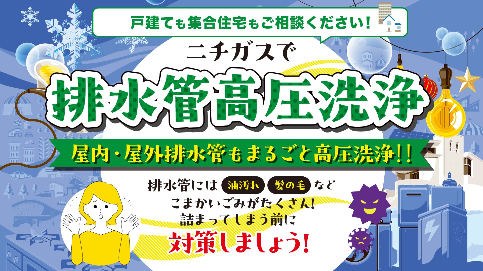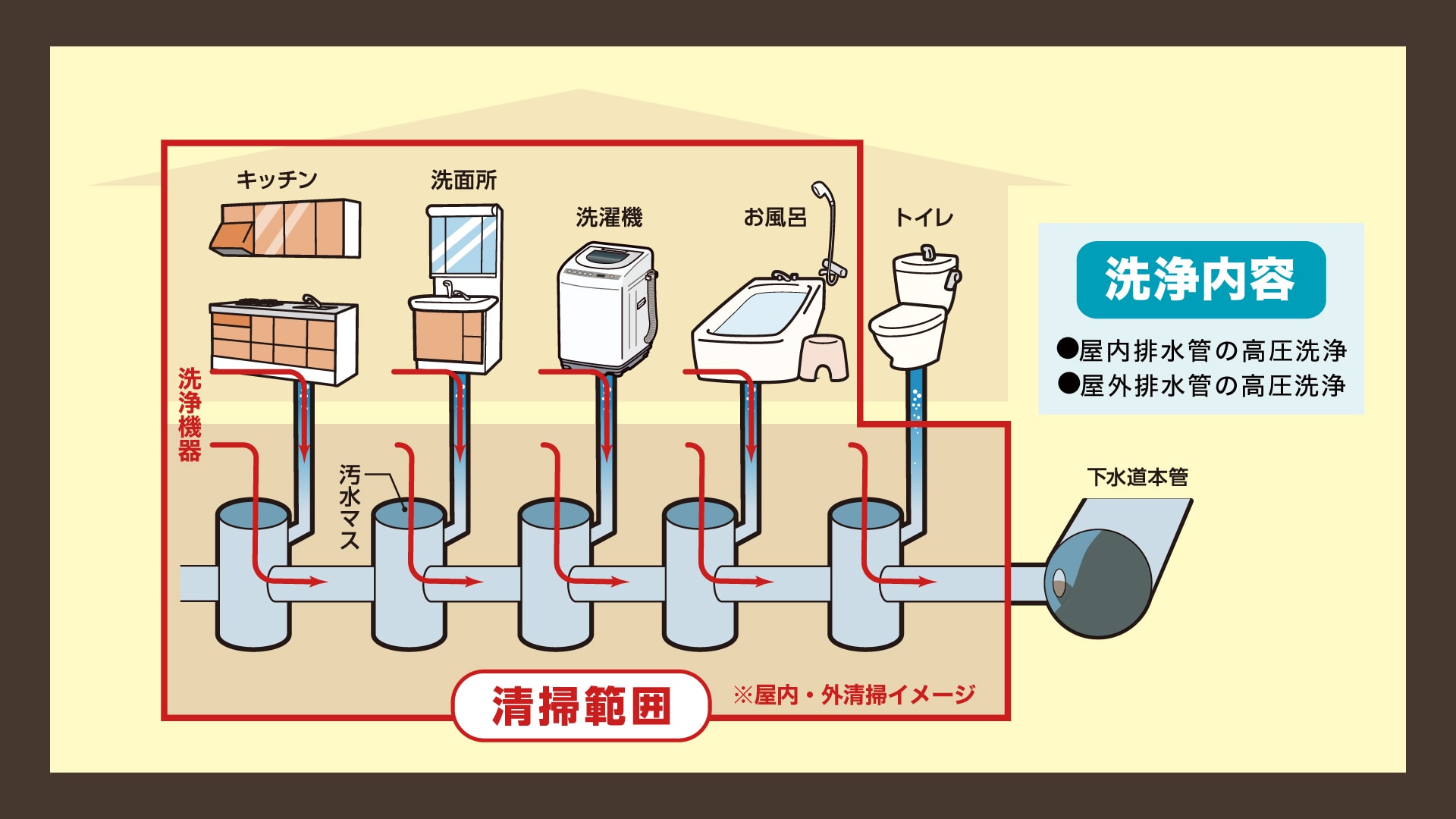キッチン、洗面台、お風呂、洗濯機の排水管から、 屋外の汚水マスまで、家一軒まるごと洗浄可能です。