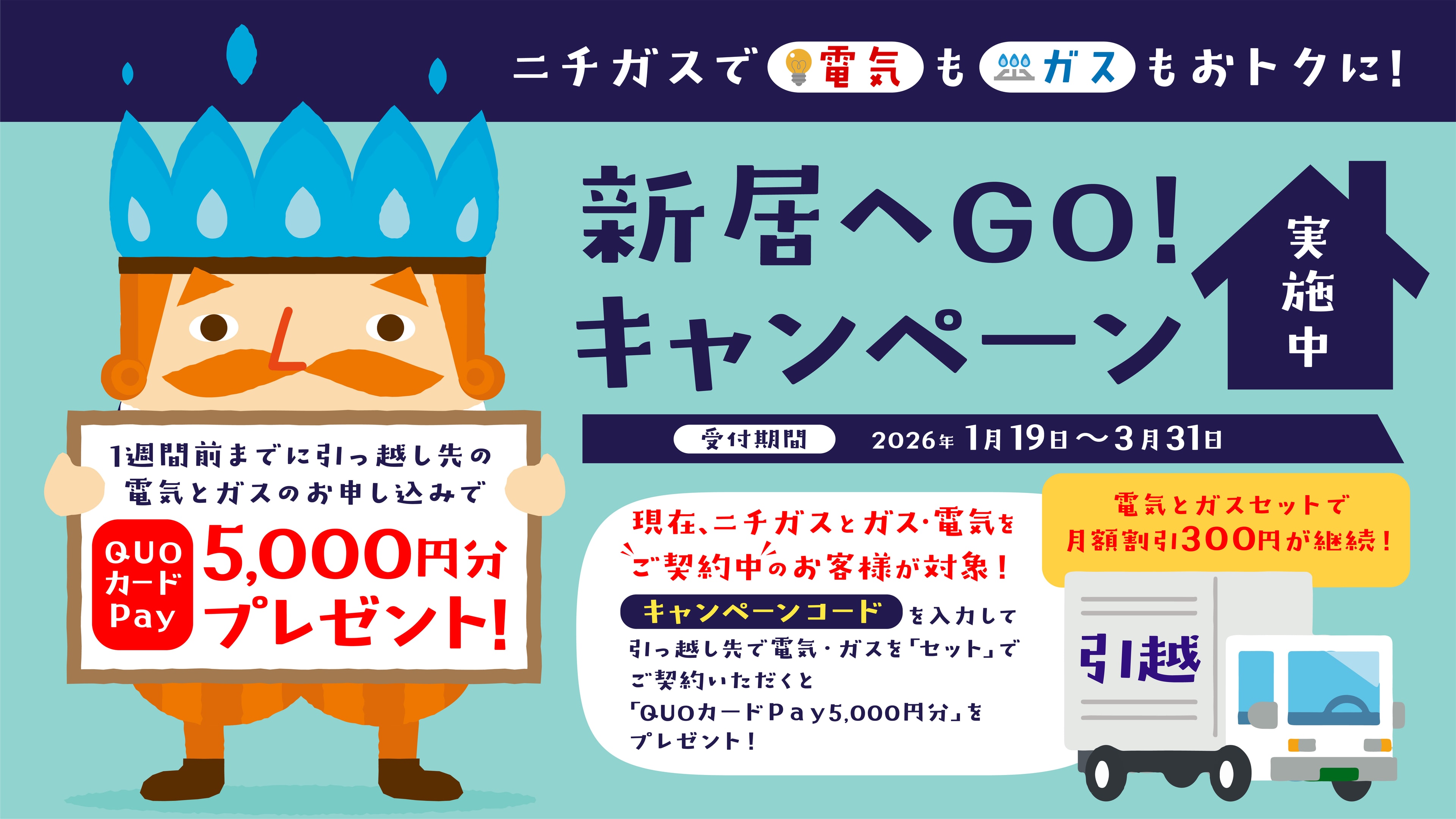 現在ニチガスと電気またはガスをご契約中のお客さまで、引っ越し先(移転先)で新たに「電気・ガス」をセットでご契約いただけるお客さま