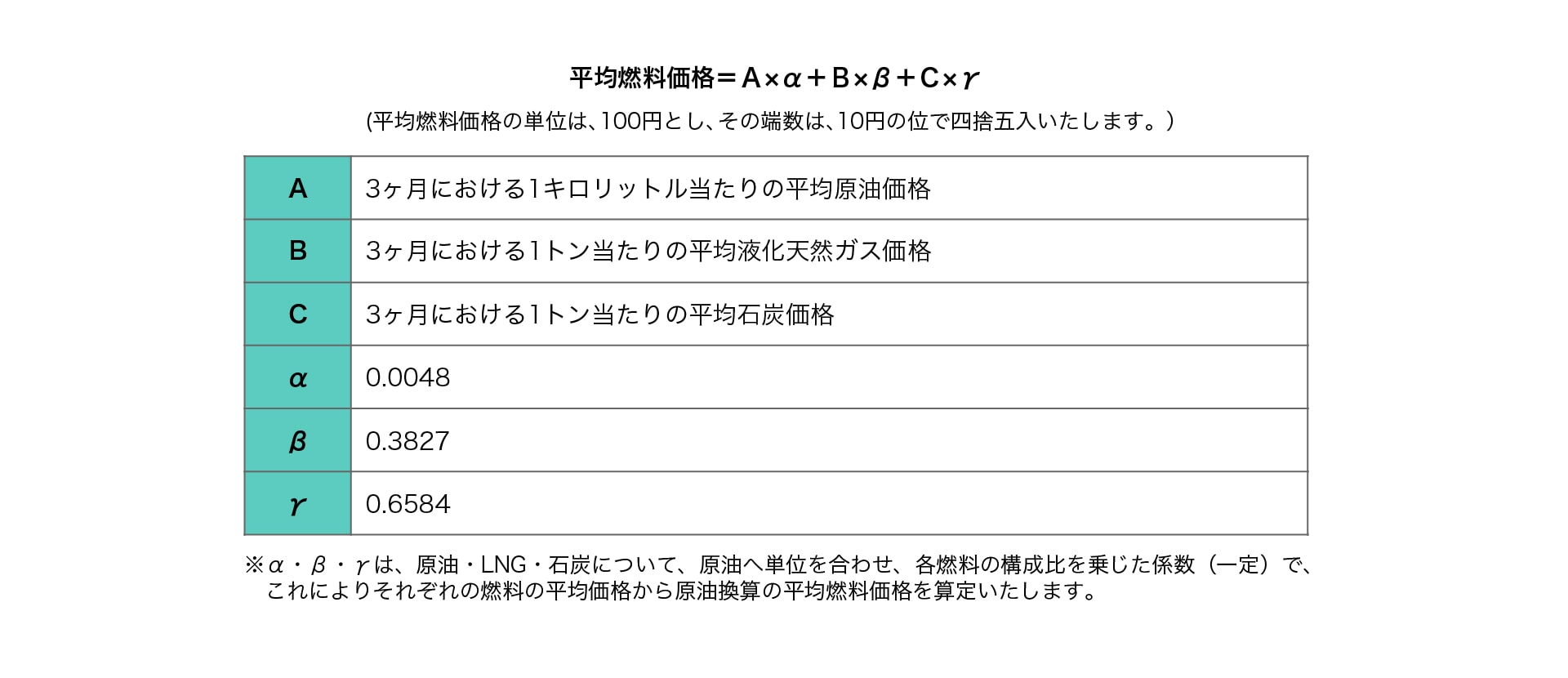 火力燃料(原油・LNG〔液化天然ガス〕・石炭)の3か月間の貿易統計価格にもとづき、毎月平均燃料価格を算定いたします。