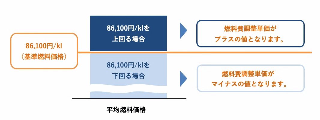 算定された平均燃料価格と基準燃料価格との差分にもとづき、燃料費調整単価を算定いたします。なお、燃料費調整単価には上限がありません。