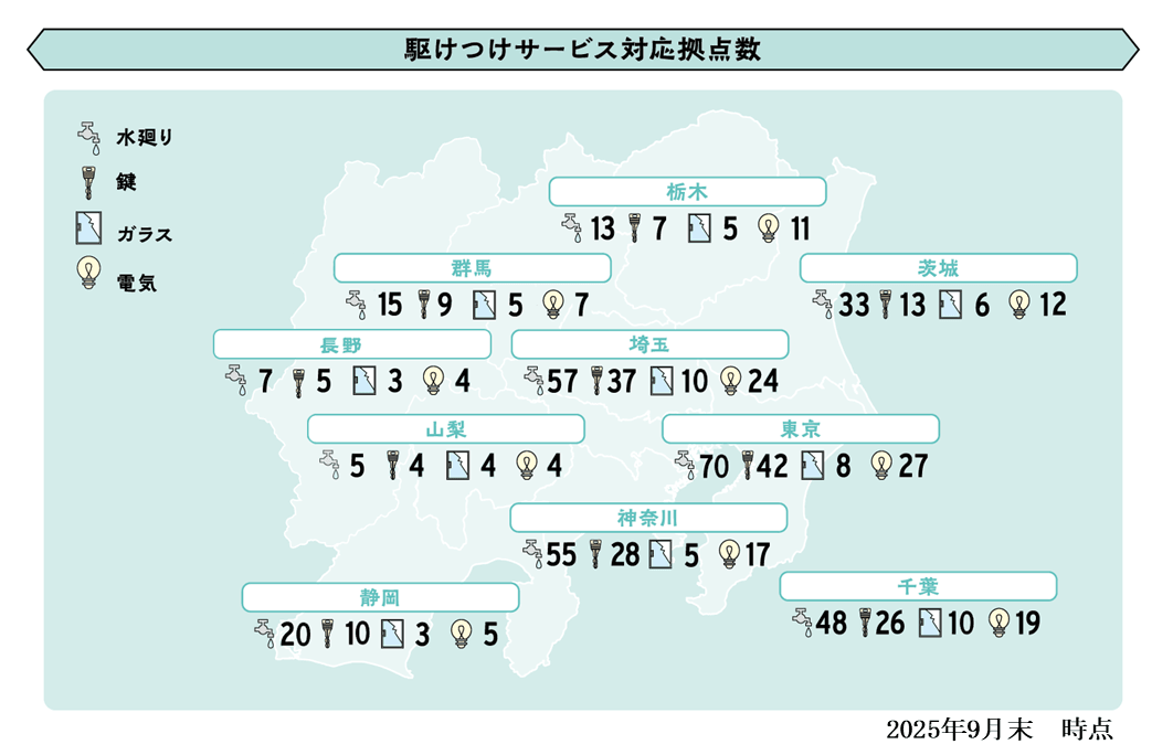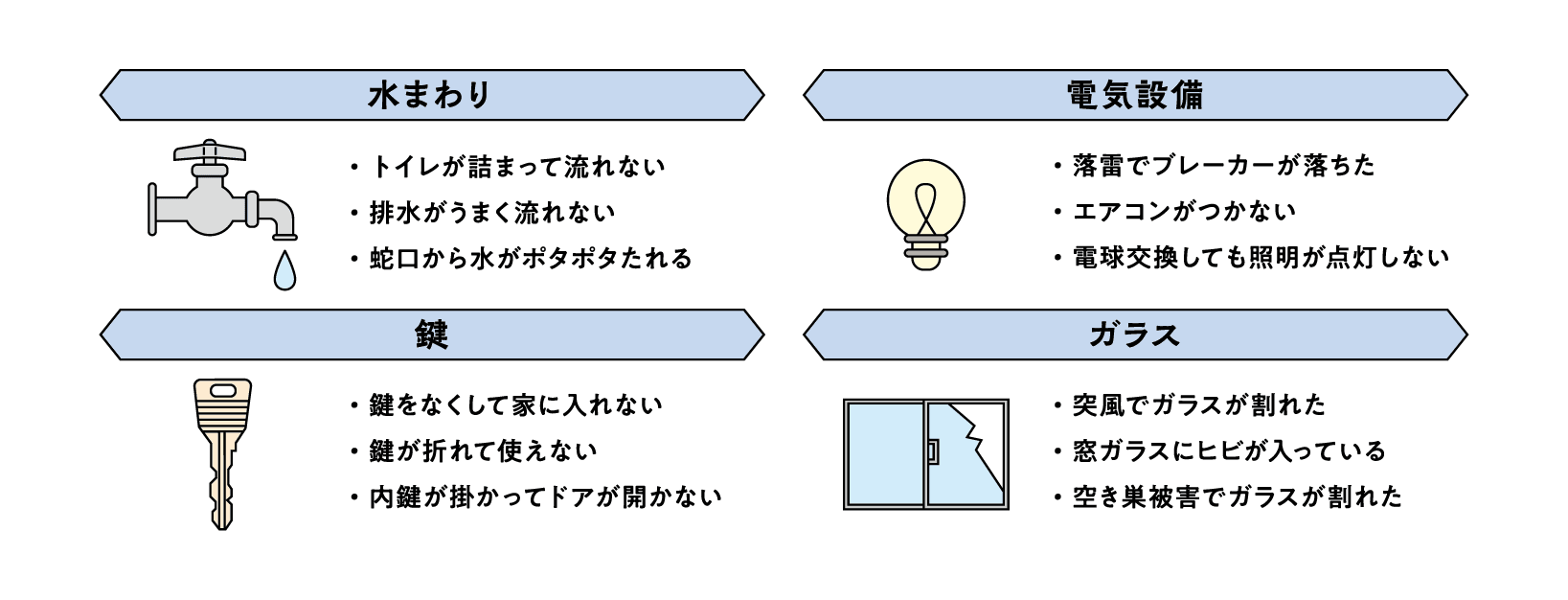 水まわり・電気設備・鍵・ガラスのトラブルも、無料で応急対応いたします。
