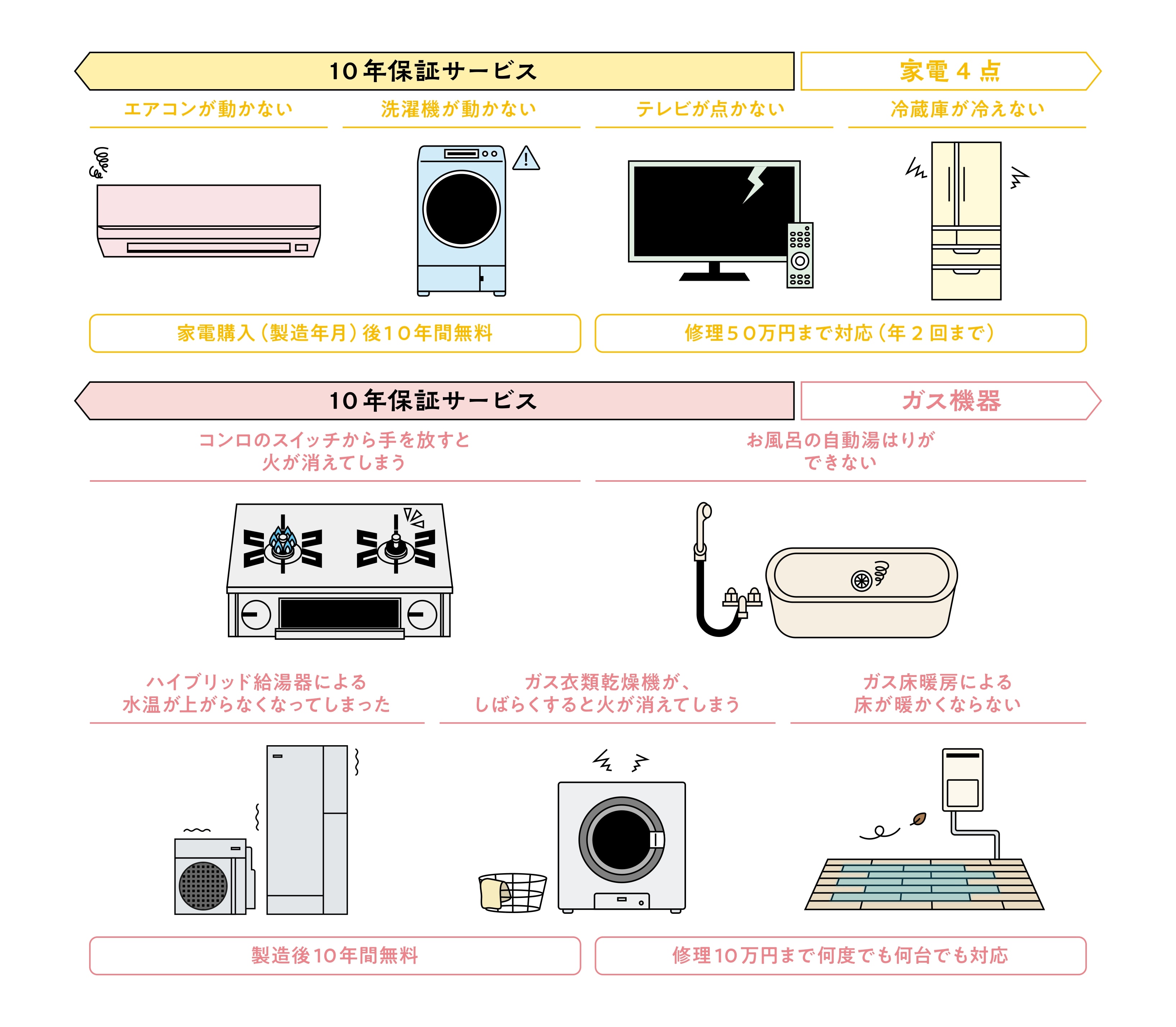 お使いの家電4点[エアコン・洗濯機・冷蔵庫(200L未満を除く)・液晶テレビ]+ガス機器(業務用・外国製品除く)が10年間、無料で修理を受けられます。他店で買ったものも対象になります。