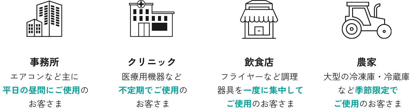 動力を契約されている方、ご商売で動力機器を活用の皆さまは、ニチガスの「動力メニュー」もご検討ください。「ガス・お家のでんき・動力メニュー」の3つをセットでご契約いただくと、毎月600円が割引となります。さらに、「ニチガスでんきの安心サポート」がつきます。電気のトラブルには24時間いつでもプロが駆けつけるので安心です!