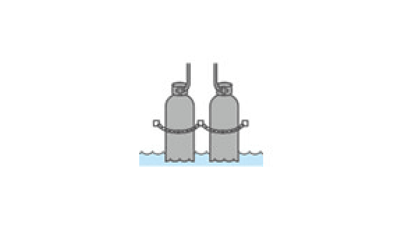 容器バルブを閉め、容器が倒れたり、流されたりしないようにロープなどでしっかりと固定してください。