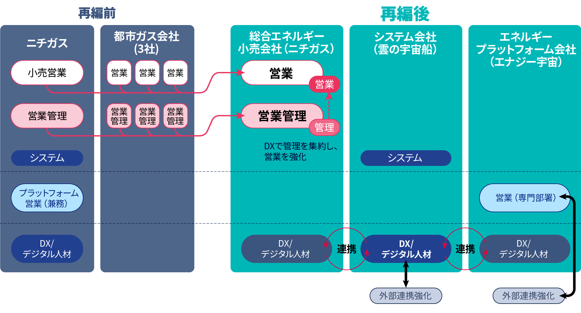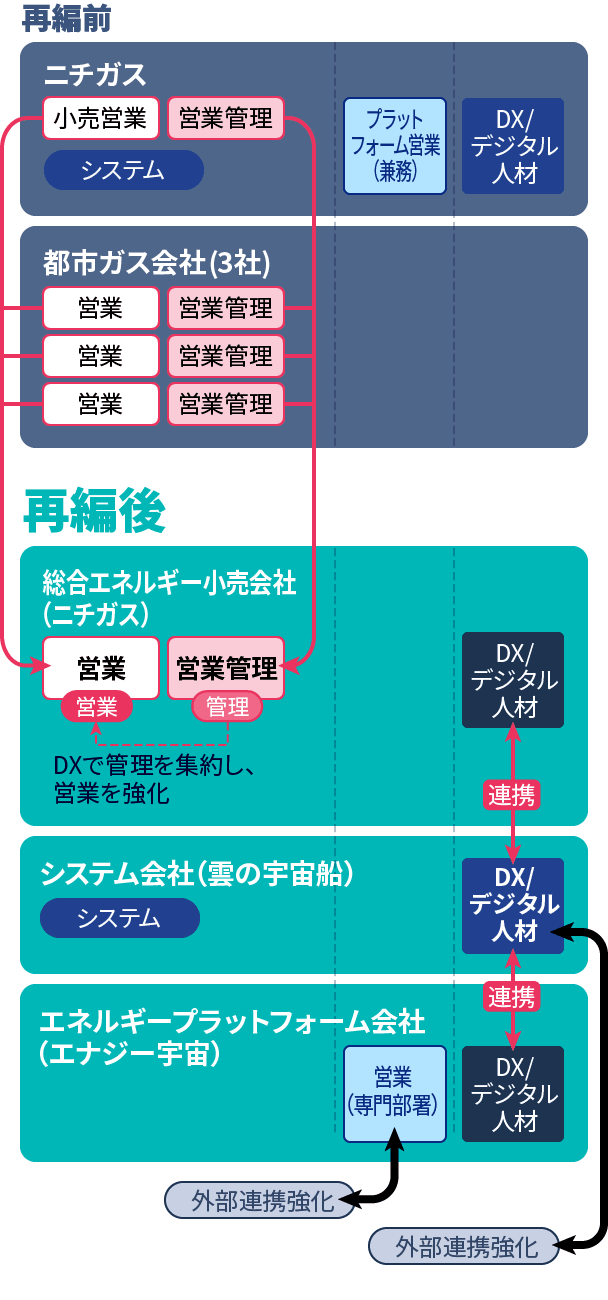 2024年1月に当社及びグループ都市ガス3社を統合し、総合エネルギー小売会社(ニチガス)、エネルギープラットフォーム会社(エナジー宇宙)に再編、システム会社(雲の宇宙船)と合わせて3つの機能に分ける組織再編を実施しました。この組織再編により各社員の特性を踏まえて人材を再配置し、エネルギー小売、プラットフォーム、IT/DXの各分野の取組みを加速させます。