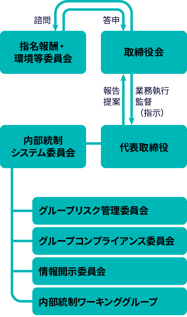 当社は業務の適正性を確保するための体制として、内部統制システム委員会(委員長:代表取締役社長)を設置し、その下部組織としてグループリスク管理委員会(委員長:法務部長)、グループコンプライアンス委員会(委員長:同)、情報開示委員会(委員長:コーポレート本部長)および内部統制ワーキンググループ(統括責任者:法務部長)を編制しています。